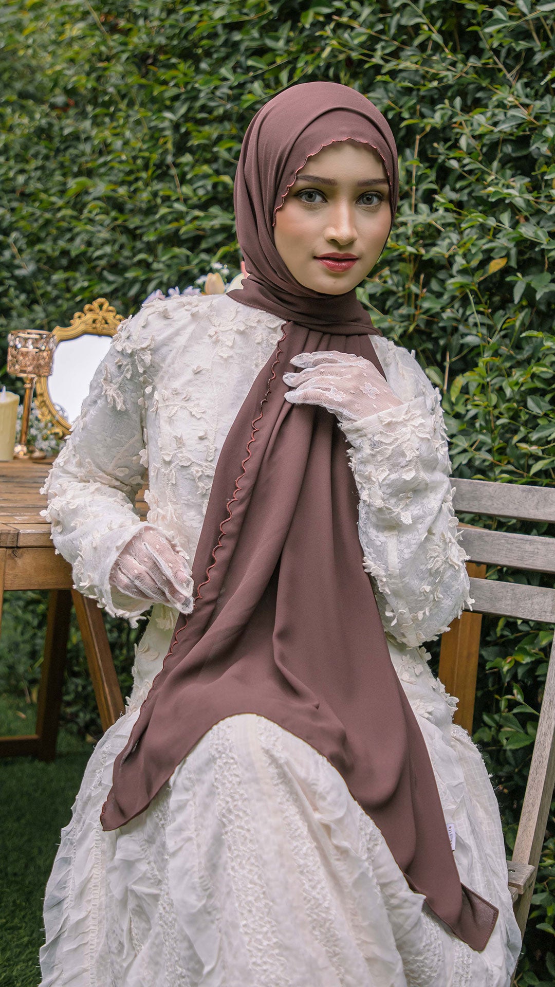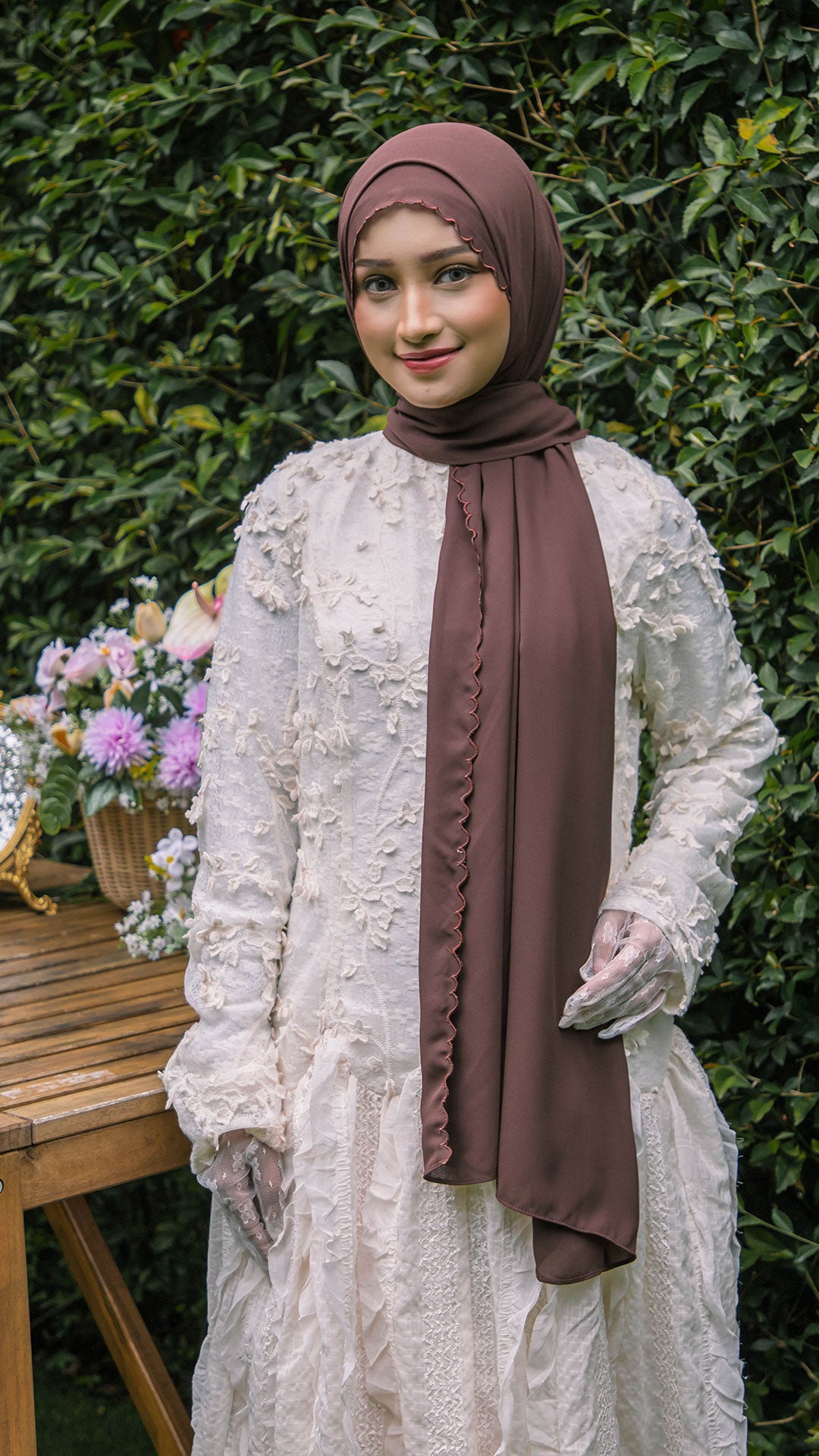 The shawl shapes effortlessly around the face, allowing for neat, structured styling or soft, flowy drapes depending on your preference. The elegant sulam (embroidery) detail inspired by the Teratai flower adds a subtle yet sophisticated charm a refined accent that elevates even the simplest outfit.