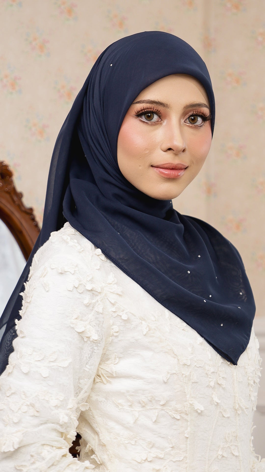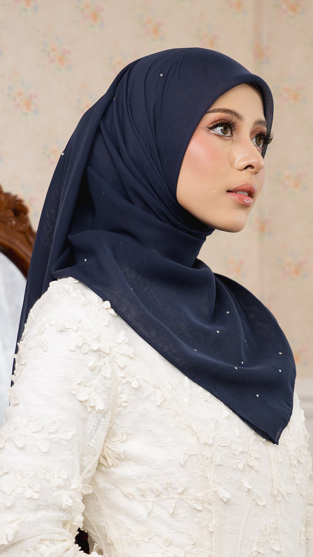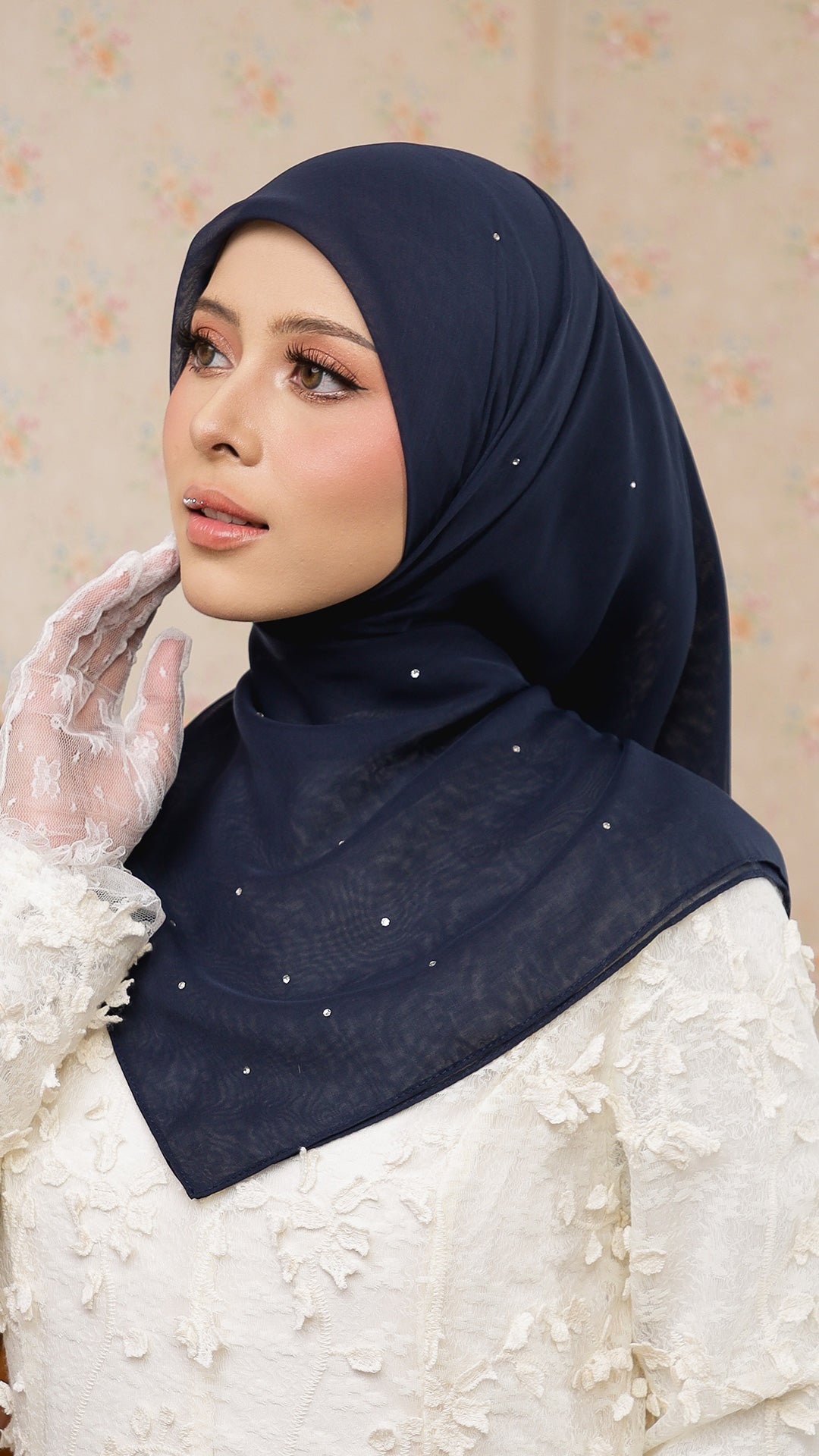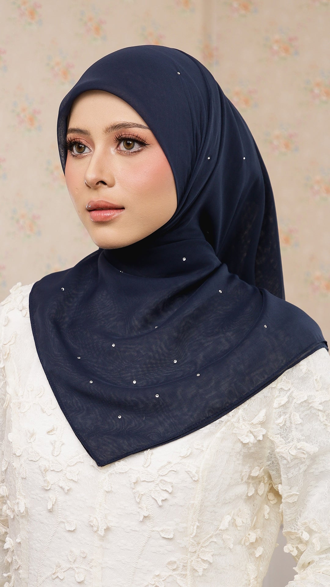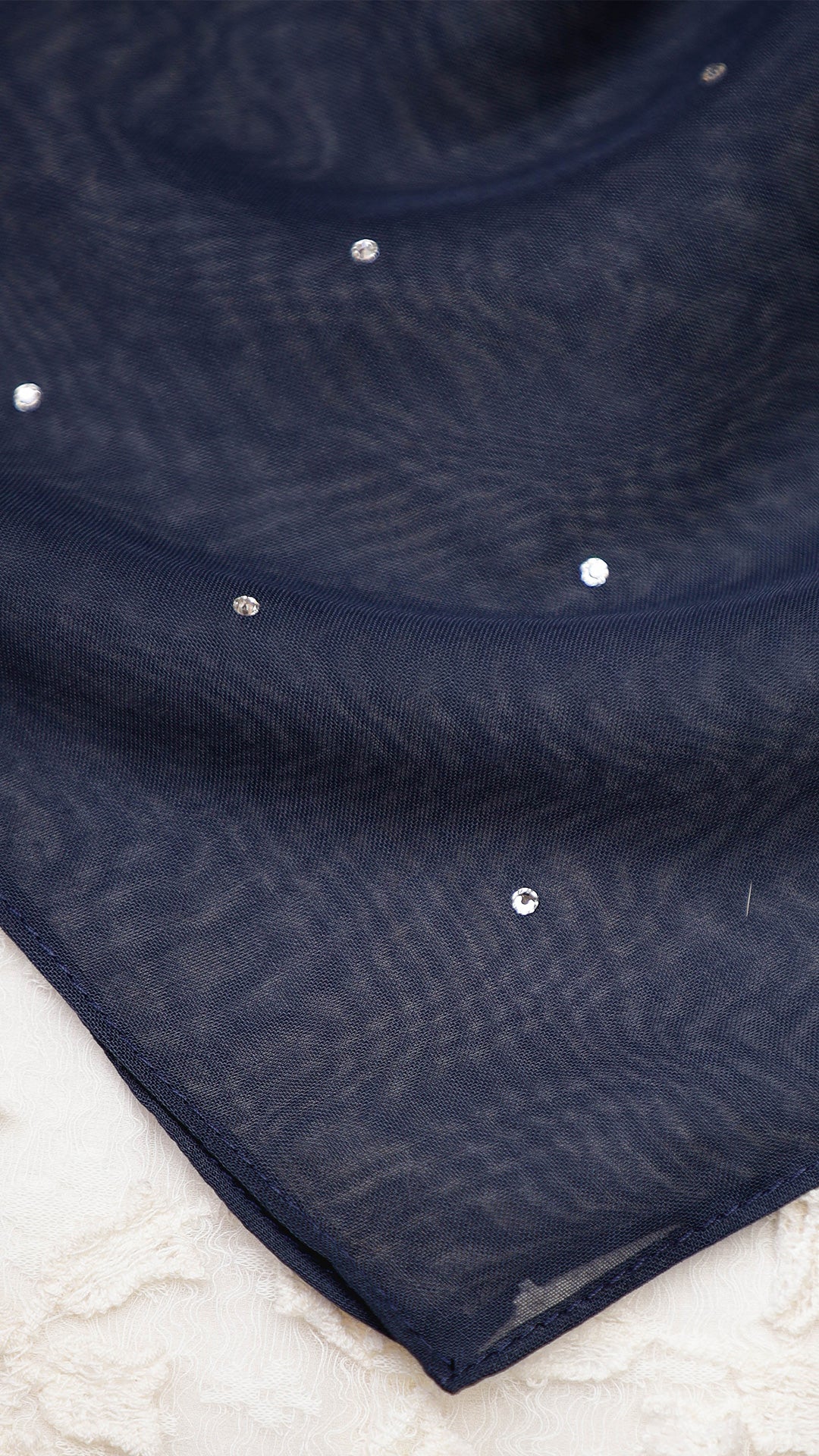 The Sofia Bawal represents a refined approach to contemporary hijab styling. This 45 x 45 inch square combines Japanese Voile a breathable, lightweight fabric prized for its fluid drape with authentic Swarovski crystals for subtle luminosity. With a 7/10 opacity rating, it delivers substantial coverage without compromising comfort or visibility.