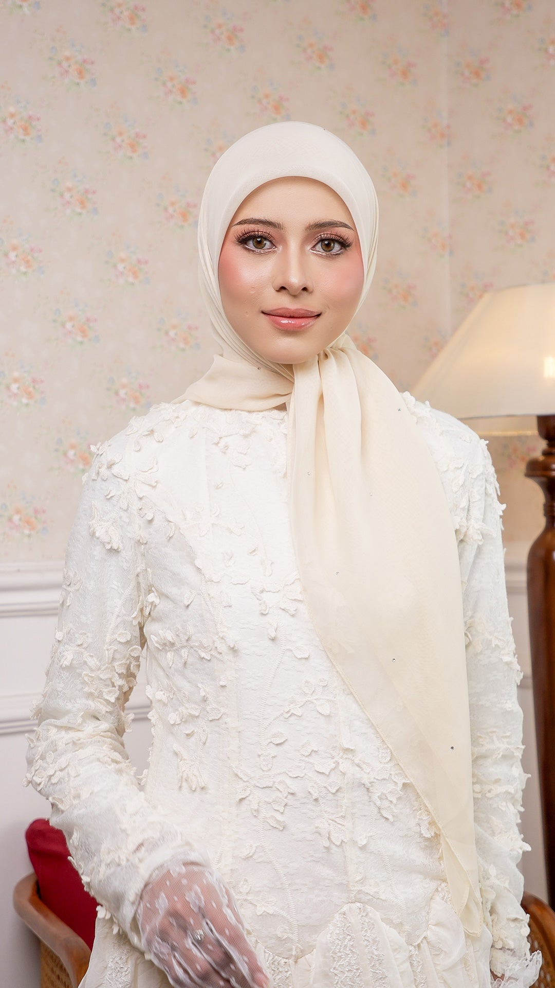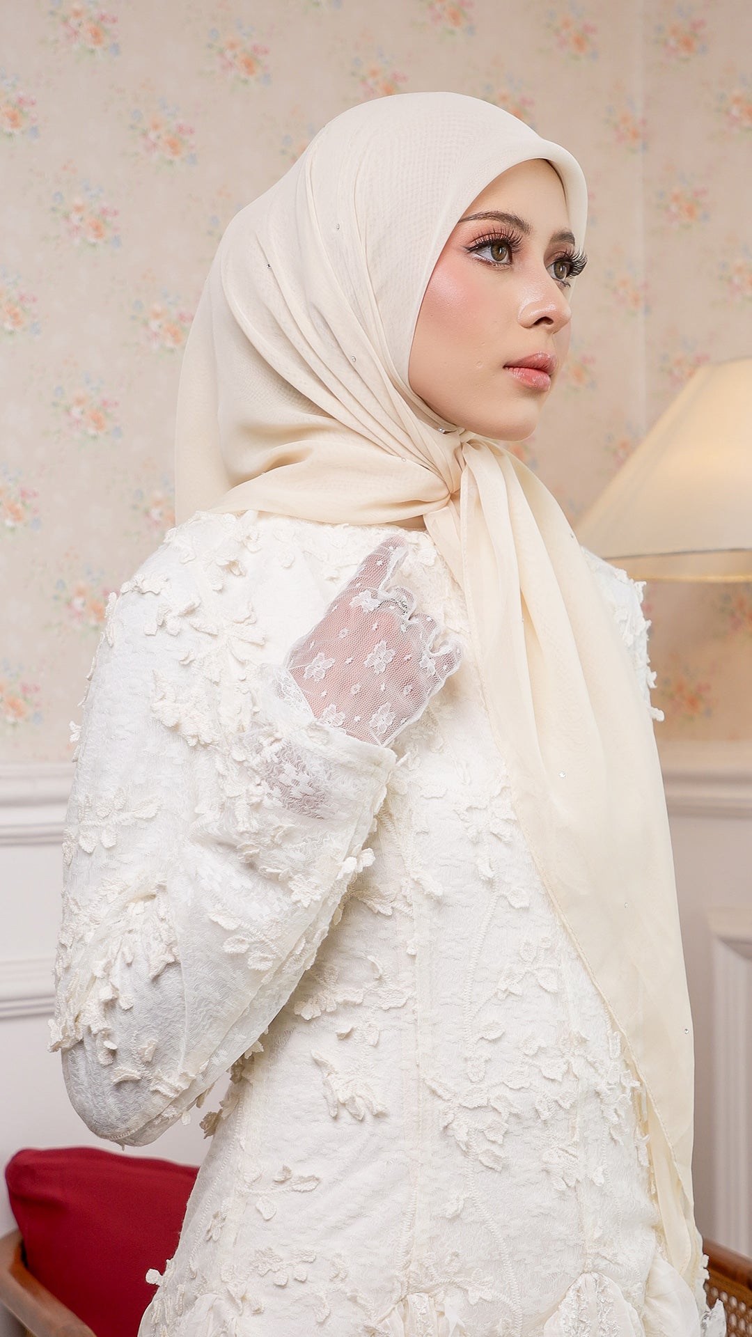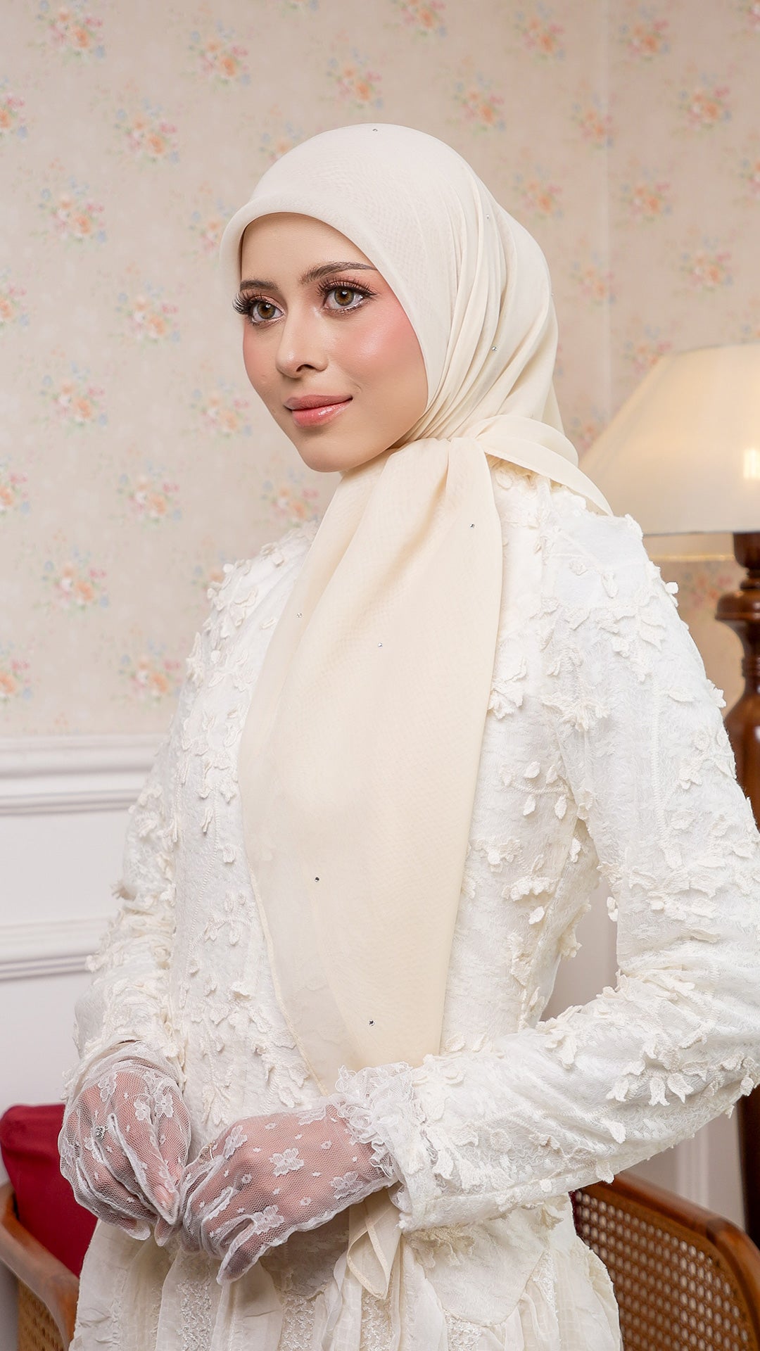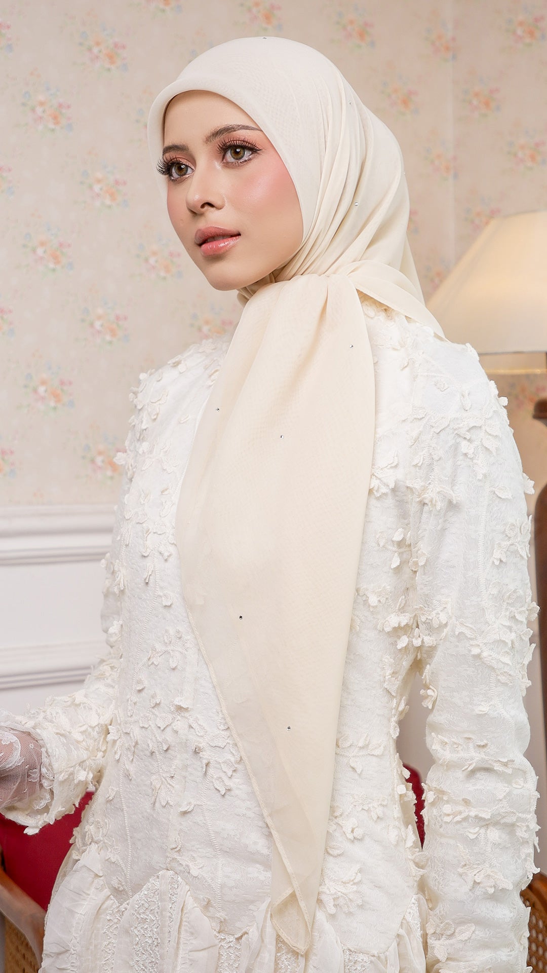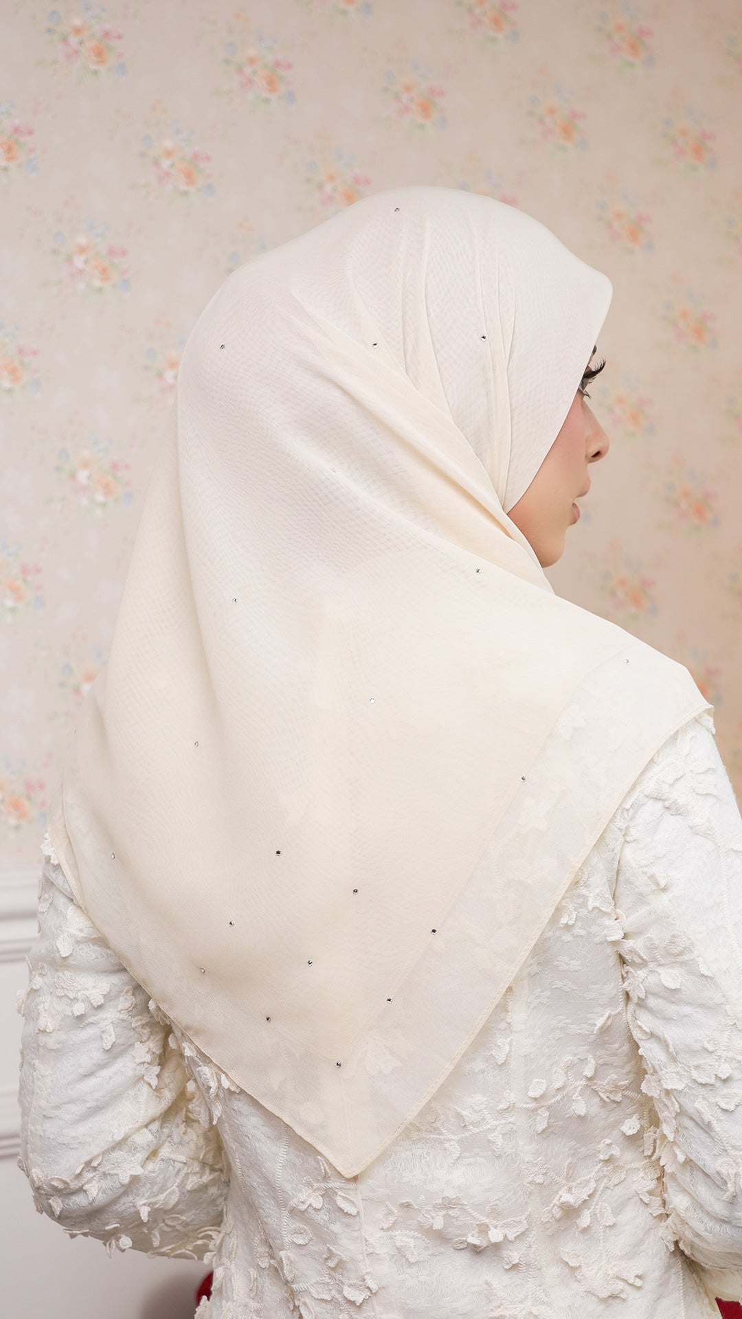 The Sofia Bawal represents a refined approach to contemporary hijab styling. This 45 x 45 inch square combines Japanese Voile a breathable, lightweight fabric prized for its fluid drape with authentic Swarovski crystals for subtle luminosity. With a 7/10 opacity rating, it delivers substantial coverage without compromising comfort or visibility.