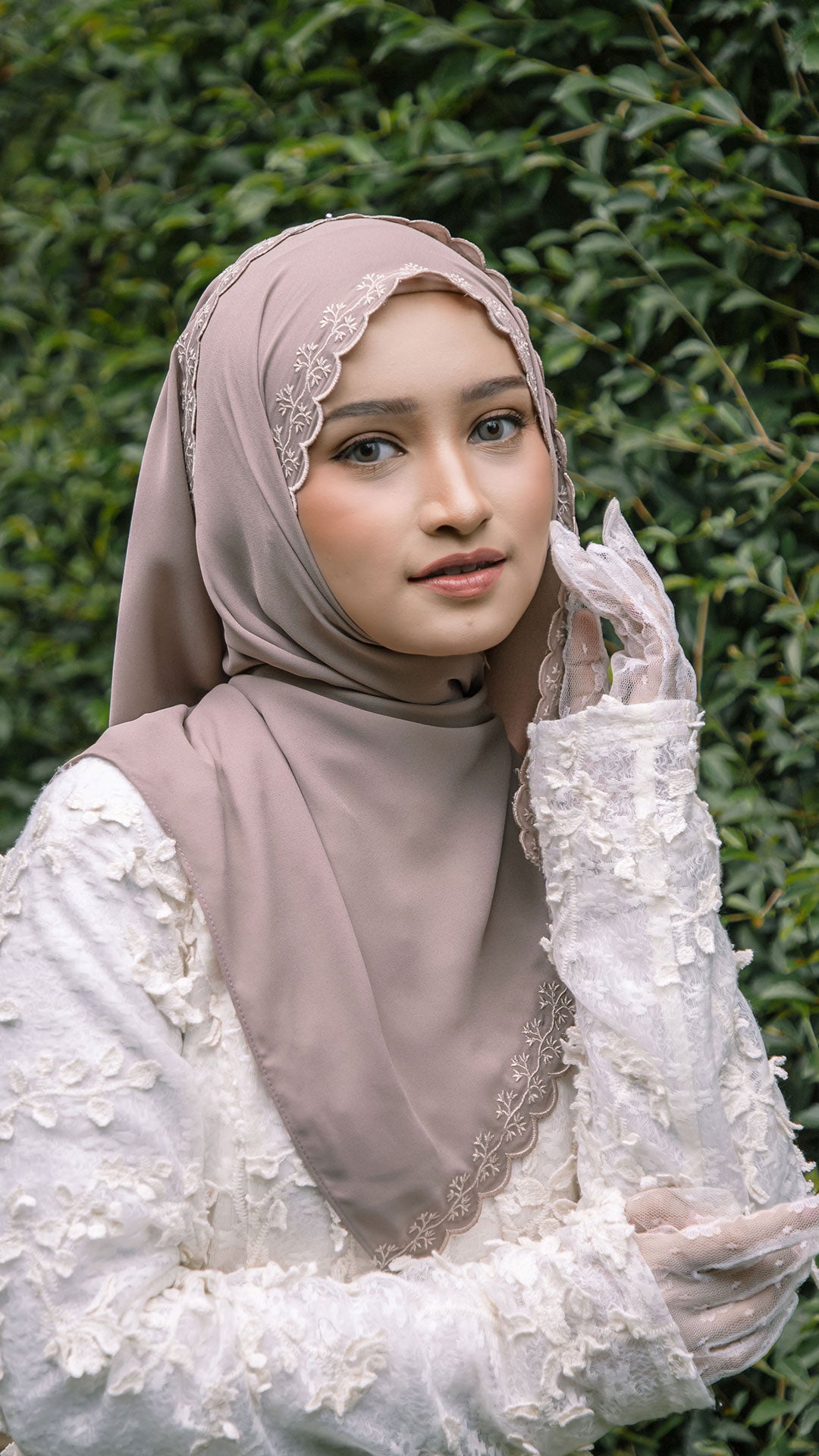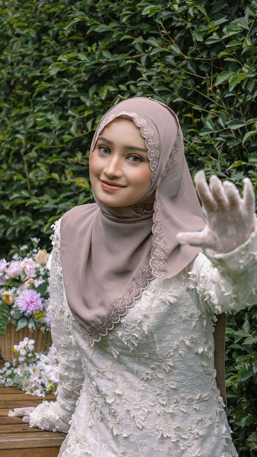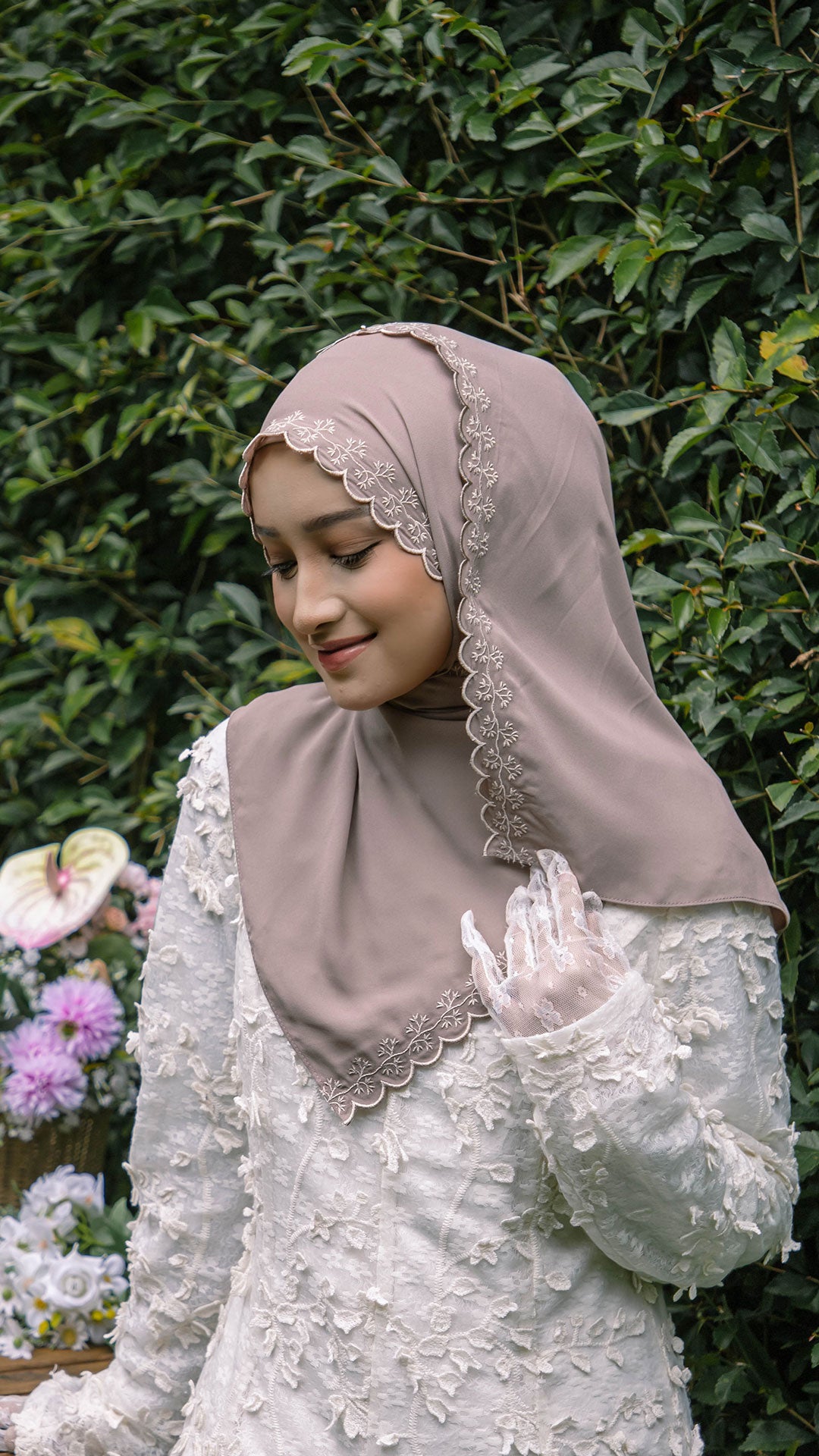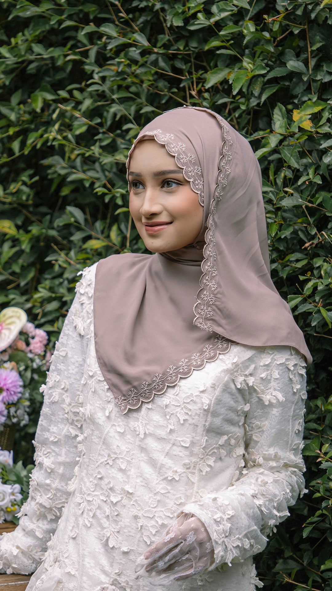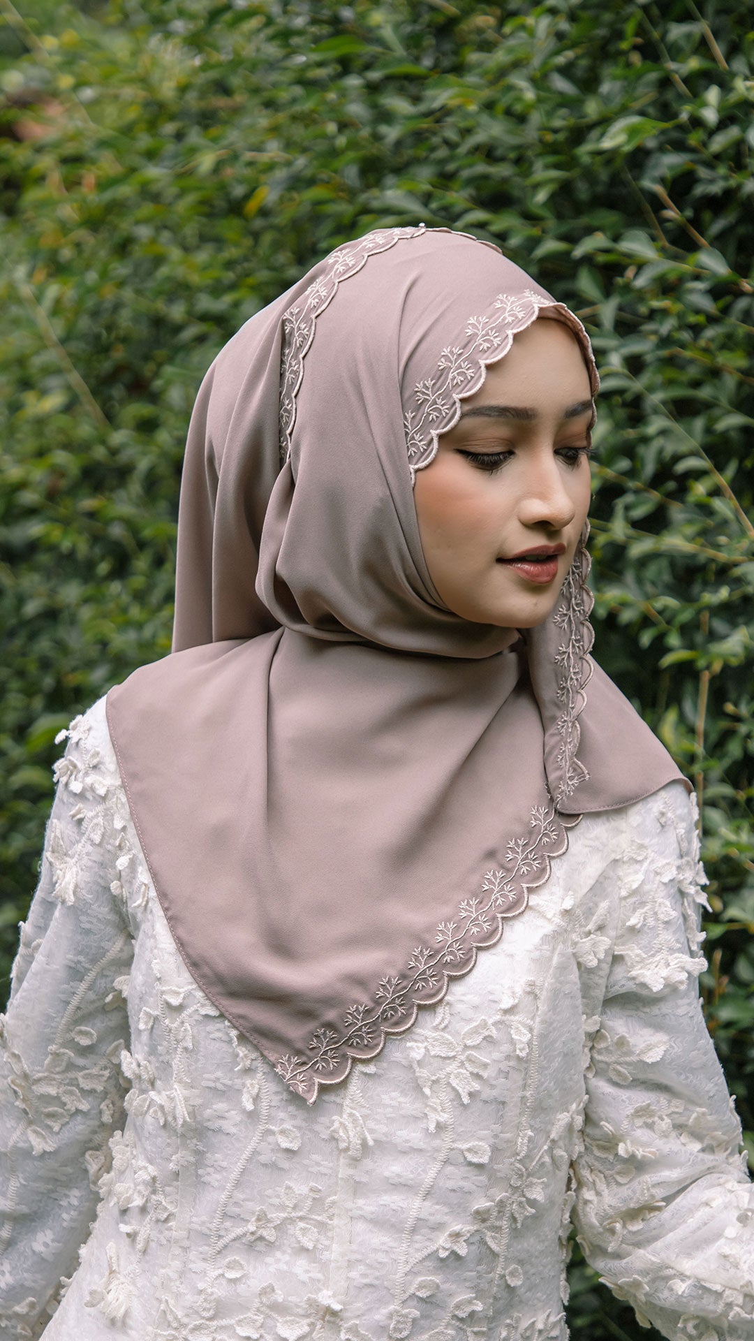 The shawl shapes effortlessly around the face, allowing for neat, structured styling or soft, flowy drapes depending on your preference. The elegant sulam (embroidery) detail inspired by the Melur flower adds a subtle yet sophisticated charm a refined accent that elevates even the simplest outfit.